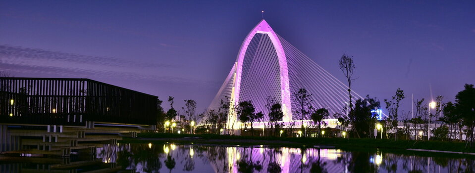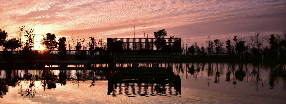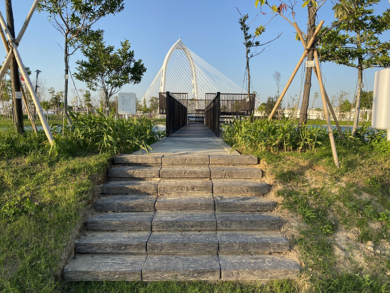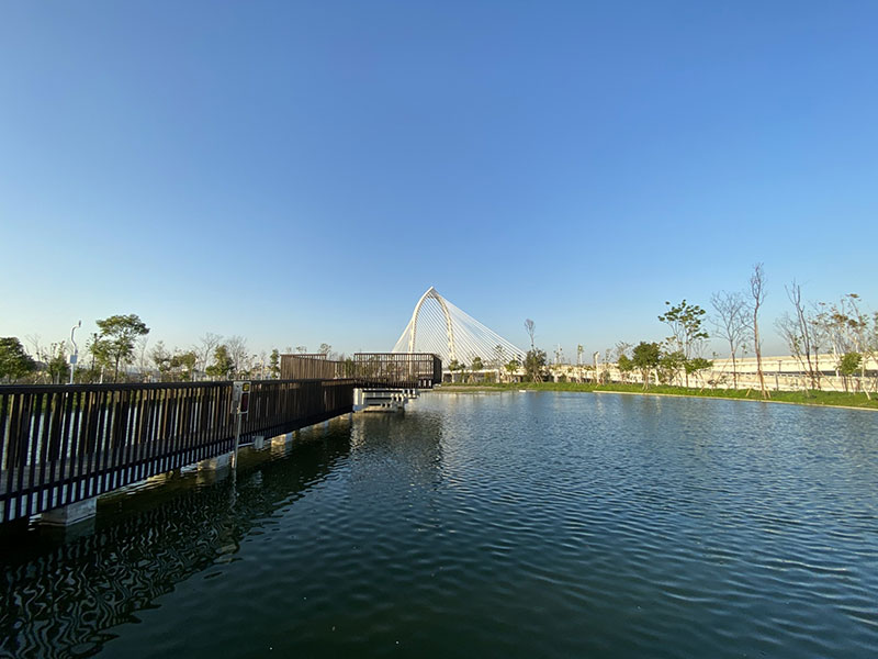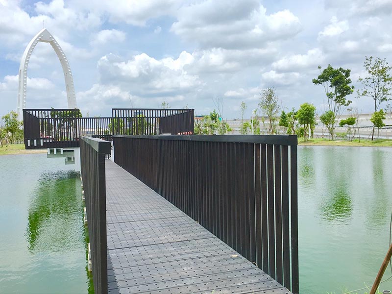 位於公園最北端,懸於人工景觀池上的,是經過特殊設計的木製平台。四方形的平台,朝向湖面高度逐漸下降,象徵人與人之間距離逐漸拉近。也是爆紅景點#抹茶湖的所在地。與木製平台相望的是純白色的#科湳愛琴橋,可以看到不少遊客選擇在這拍照取景。