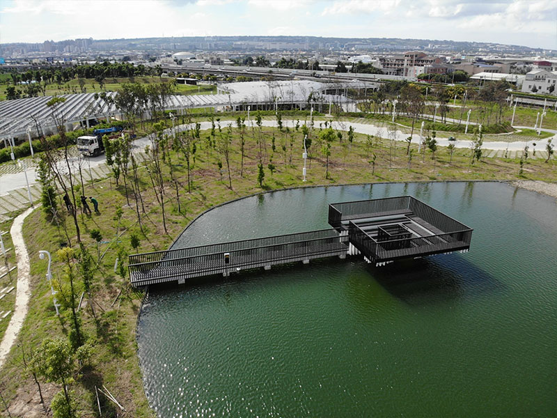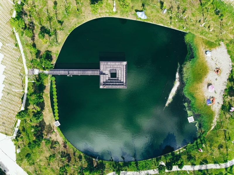 空拍照出湖面在白天,會呈現出如抹茶般的深綠色,因而被取為「抹茶湖」。這個帶著可愛又療癒名稱的人工景觀湖,現在可是超熱門的打卡區!常和一旁的純白科湳愛琴橋一同入鏡,綠白相映超美~