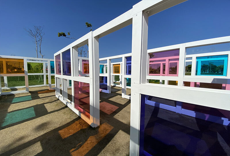 位於視覺體驗區的「水湳普普風濾色地景裝置藝術」,也就是彩色玻璃迷宮區。搭配多變的顏色和光影濾色效果,表現出些許不羈與頑皮的活潑感,使得每個角度都很上鏡。