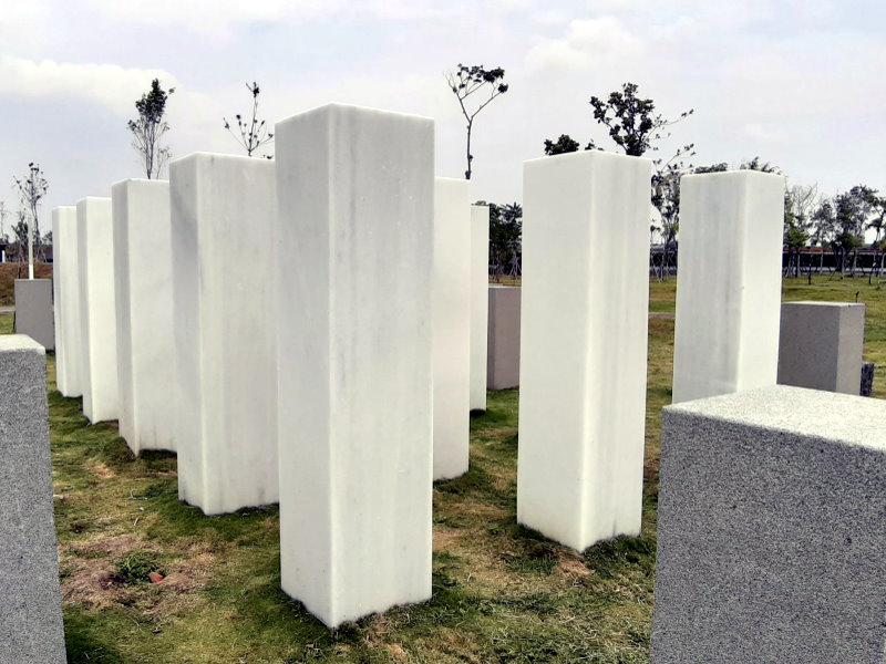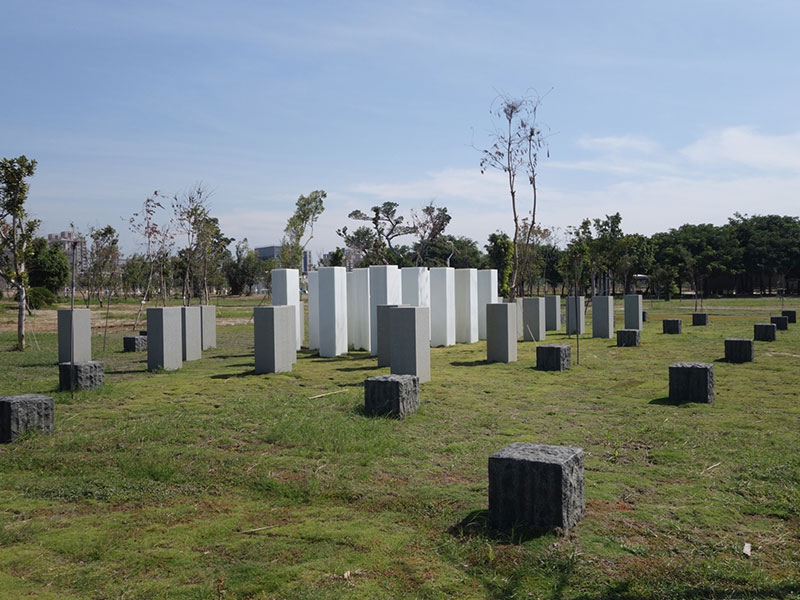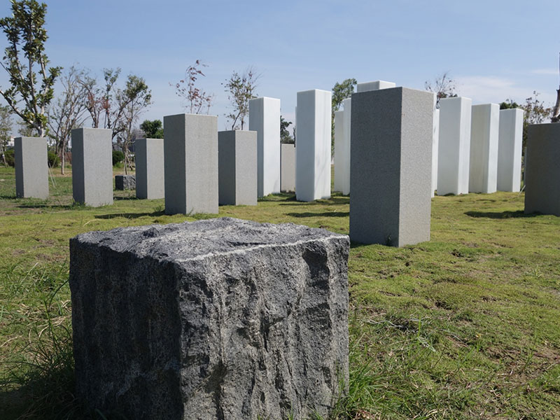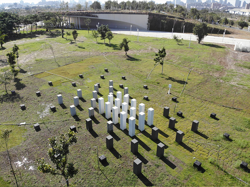 佇立在觸覺體驗區內的排排石柱,總共分為三個區塊,由白色光面花崗岩、灰色略帶粗糙花崗岩和黑色粗糙花崗岩所組成,並從高到低、從白到黑、從細緻到粗糙依序排列。依顏色深淺,石材吸收的日照能量不同,觸碰時感受到的溫度也會有所不同。根據石柱高低,還能帶給民眾不同的互動體驗。