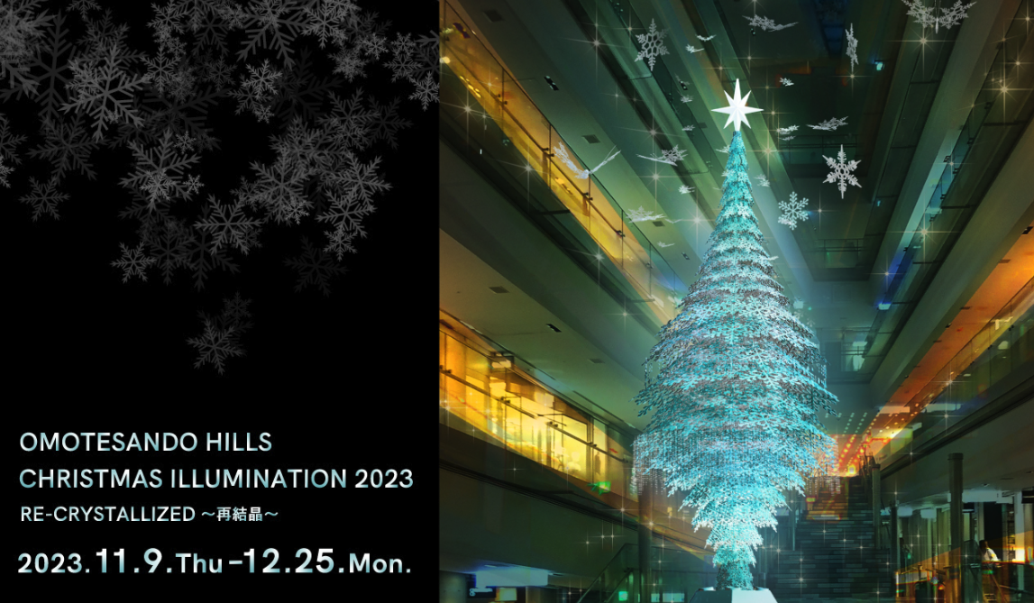 表參道Hills 2023年聖誕點燈以冰珠寶作為概念,打造閃耀透明光芒的點燈裝飾,最重要的看點就是本館大階梯以「RE CRYSTALLIZEDCRYSTALLIZED~再結晶~」為題,高達10公尺的纖細聖誕樹是透過3D列印,使用了可回收PET素材製作約500個透明的雪結晶,打造聖誕樹,利用結晶構造為概念,看起來彷彿人們正牽手一般。大階梯上方也利用3D列印打造小鳥或蝴蝶造型、晶透的幻想生物,配合樹的照明,閃耀溫柔的光芒。除了聖誕樹,館內每20分鐘就會有以「冰與火焰」為主題的聲光特別表演。