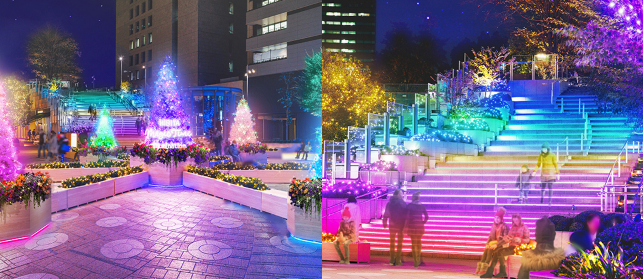 「ヒビヤ ウィンター スクエアHIBIYA WINTER SQUARE」:東京MIDTOWN日比谷入口的日比谷STEP廣場設置了7顆彩色的聖誕樹,周邊在加上花飾,不管日夜都充滿了節慶氣氛,閃耀彩色光芒的大階梯與應景的音樂讓人不自覺的就想要跳起舞來~。