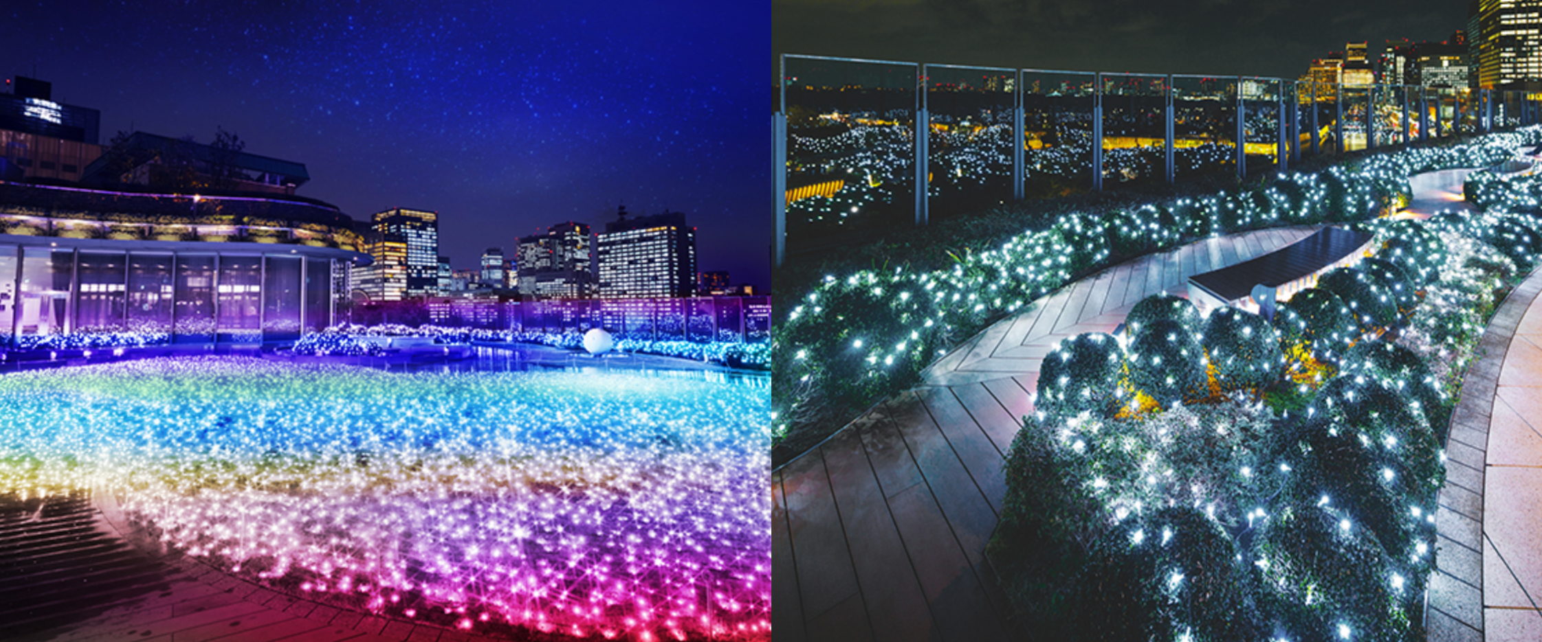 「パーク ビュー ウィンター ガーデンPARK VIEW WINTER GARDEN」:東京MIDTOWN日比谷六樓則是可以瞭望日比谷公園、皇居外苑、日比谷通り夜景的私房景點,這裡的草皮與花園都裝飾上了銀河意象夜景的浪漫燈飾。