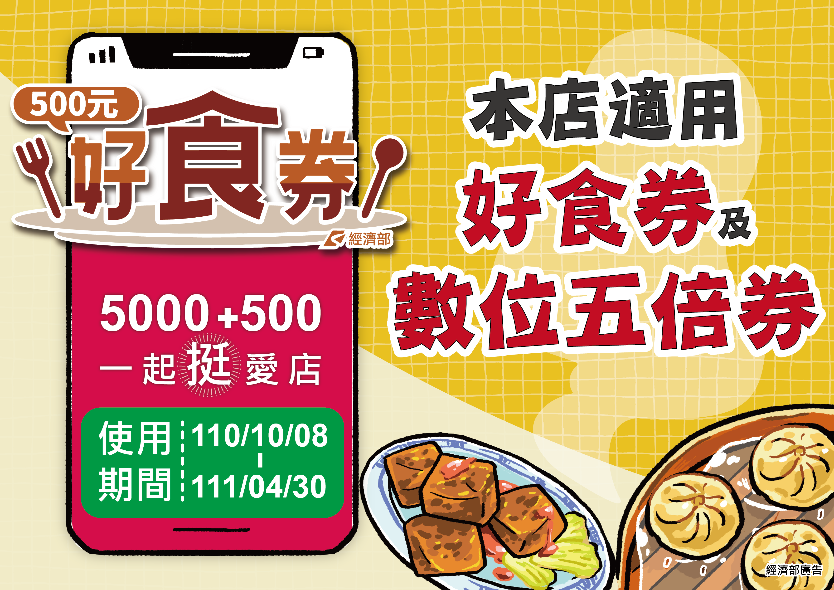 為了支持受疫情影響甚大的餐飲產業,經濟部配合行政院推出的五倍券政策,推出 400 萬份加碼券「好食券」500 元(10/7 經濟部決定再加碼,凡 10 月 29 日前綁定數位五倍券的民眾都可獲得),可用於餐飲、糕餅、夜市/市場之攤商及小微店家等,希望能刺激消費商機,振興餐飲業。