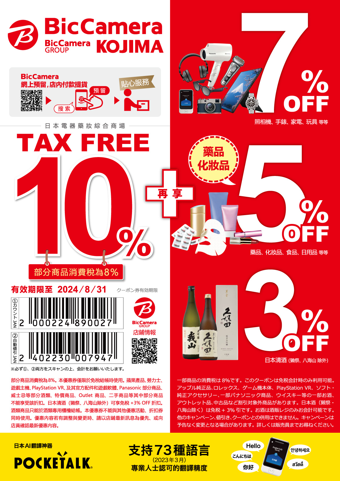 | 2024/08/31 | 【官方優惠】免稅10%+電器折扣7%(藥妝折5%,清酒折3%) | 下載優惠券>> |
