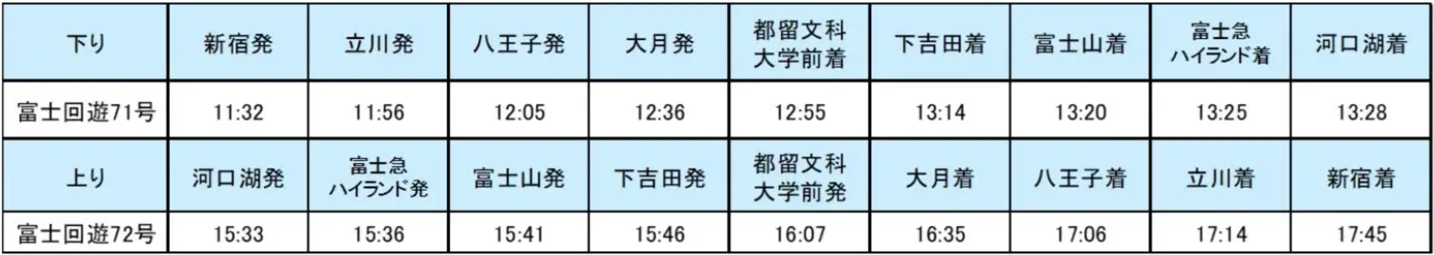 「富士回遊」停靠車站為:新宿站、立川站、八王子站、大月站、都留文科大学前、富士山、富士急樂園站。約2小時直達終點 。